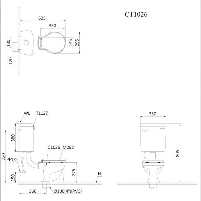 Thông số bàn cầu Caesar CT1026 thùng T1127