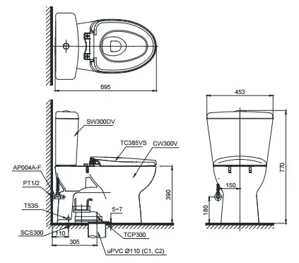 Bản vẽ kỹ thuật xí bệt TOTO CS300DRT2W