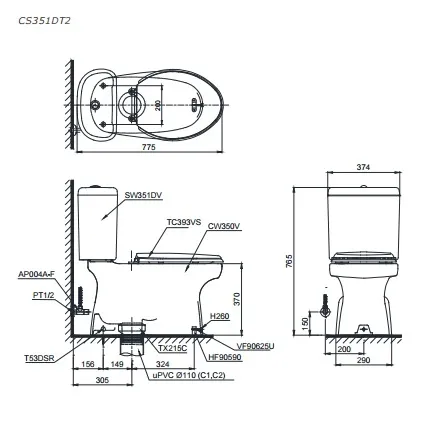 Bản vẽ kỹ thuật xí bệt TOTO CS351DT2