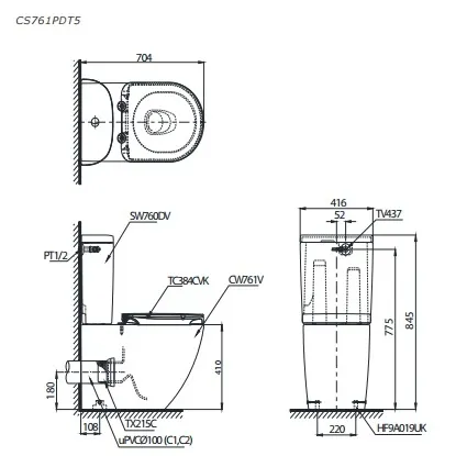 Bản vẽ kĩ thuật bồn cầu TOTO CS761PDT5#XW thoát ngang