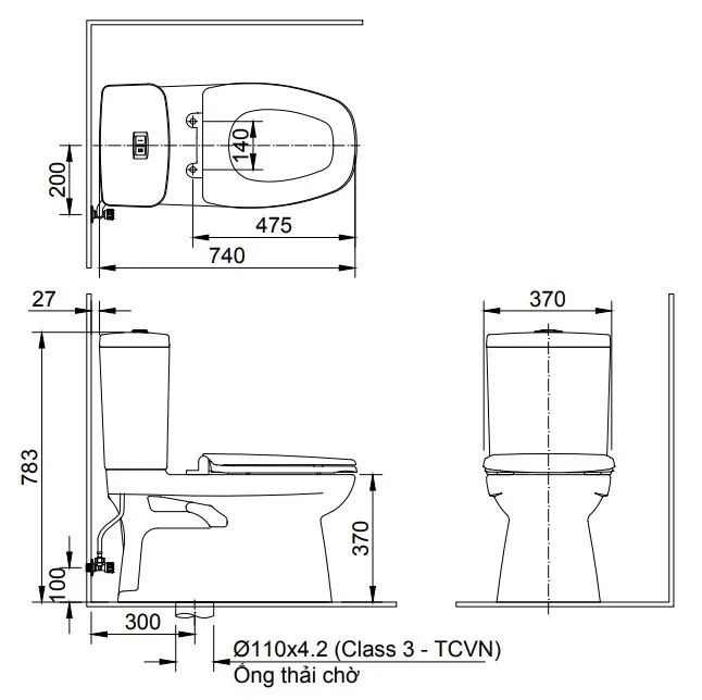 - Kiểu xả Siphon dạng nhấn 2 mức: 5.5L/3.0L