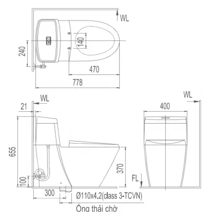 - Kích thước bồn cầu: 778 x 400 x 645 mm (dài x rộng x cao)
