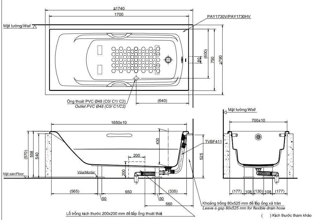 Bản vẽ kỹ thuật bồn tắm TOTO PAY1730V-TVBF411