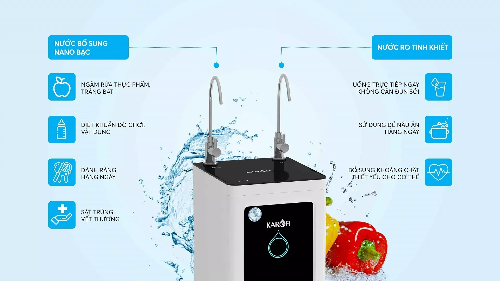 - 02 vòi đa chức năng (01 vòi lấy nước RO, 01 vòi lấy nước NanoS)