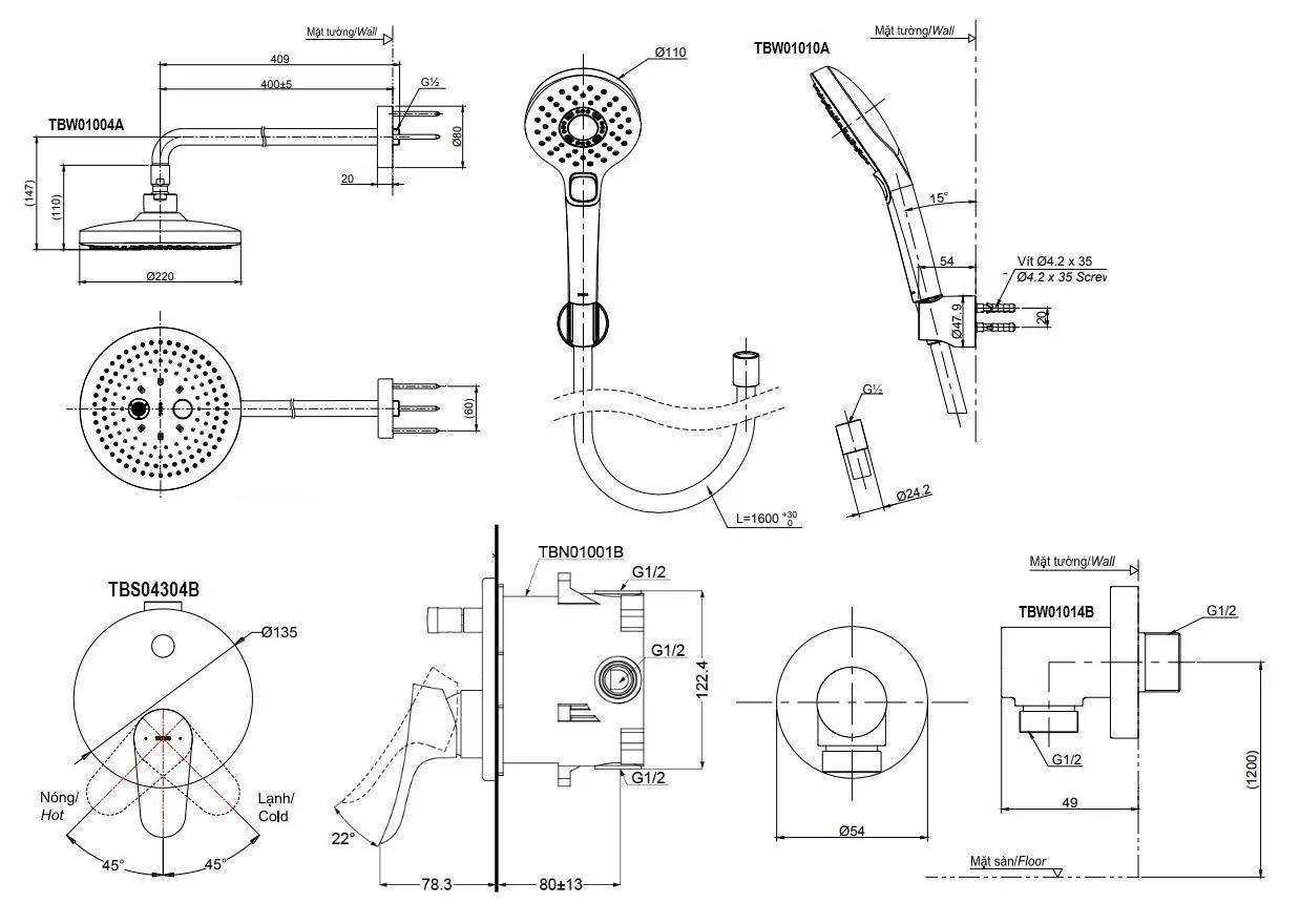 Bản vẽ bộ sen tắm TOTO TBS04304B+TBW01004A+TBW01010A
